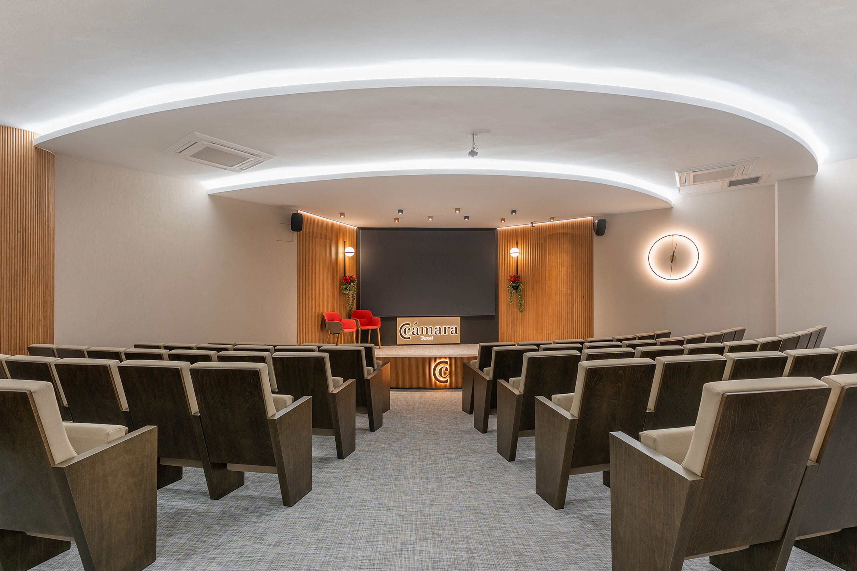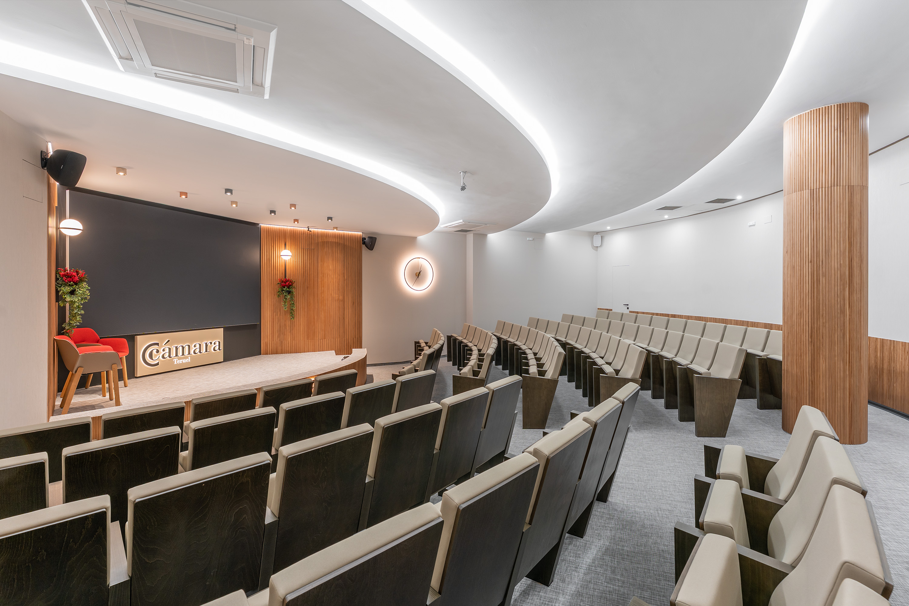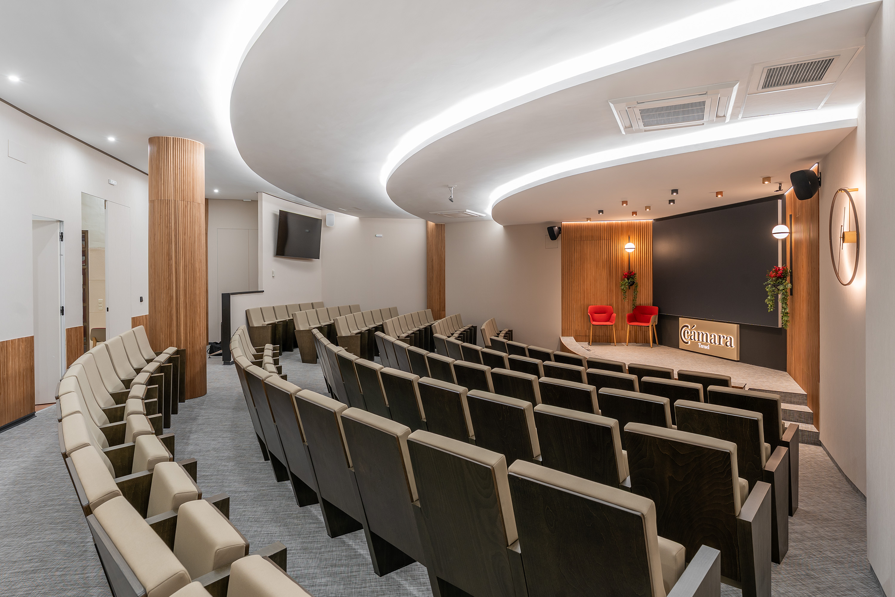Nuestros salones de actos tienen una capacidad de hasta 99 personas en Teruel y 43 en Alcañiz, así como las salas de reunión de hasta 18 personas. Todos cuentan con el equipamiento necesario, totalmente digitalizado, para el desarrollo de la actividad: sistema WIFI, pantallas de televisión, megafonía y micro de corbata, etc.
