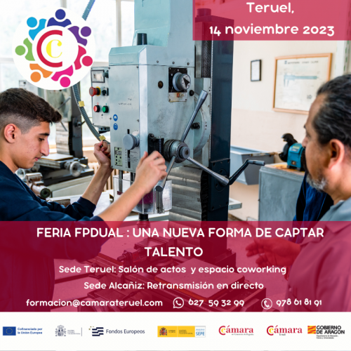 La Cámara de Teruel, con la colaboración de la consejería de Educación del Gobierno de Aragón, Y la cofinanciación del FSE , el Ministerio de trabajo y economía social y la Cámara de España, organizan la Iª Feria de Formación Profesional Dual el próximo martes, 14 de noviembre en el salón de actos de cámara.