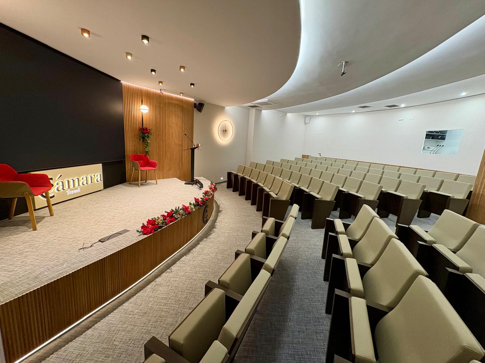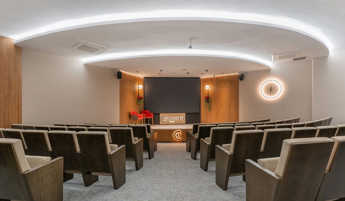 Nuestros salones de actos tienen una capacidad de hasta 99 personas en Teruel y 43 en Alcañiz, así como las salas de reunión de hasta 18 personas. Todos cuentan con el equipamiento necesario, totalmente digitalizado, para el desarrollo de la actividad: sistema WIFI, pantallas de televisión, megafonía y micro de corbata, etc.